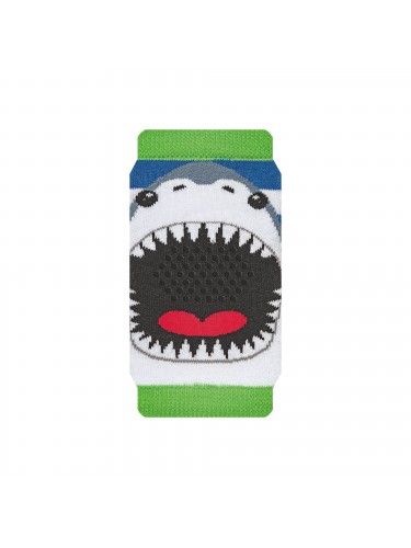 Joelheira em cores, verde, azul e branco com Estampa de Tubarão cinza branco, preto e vermelho.